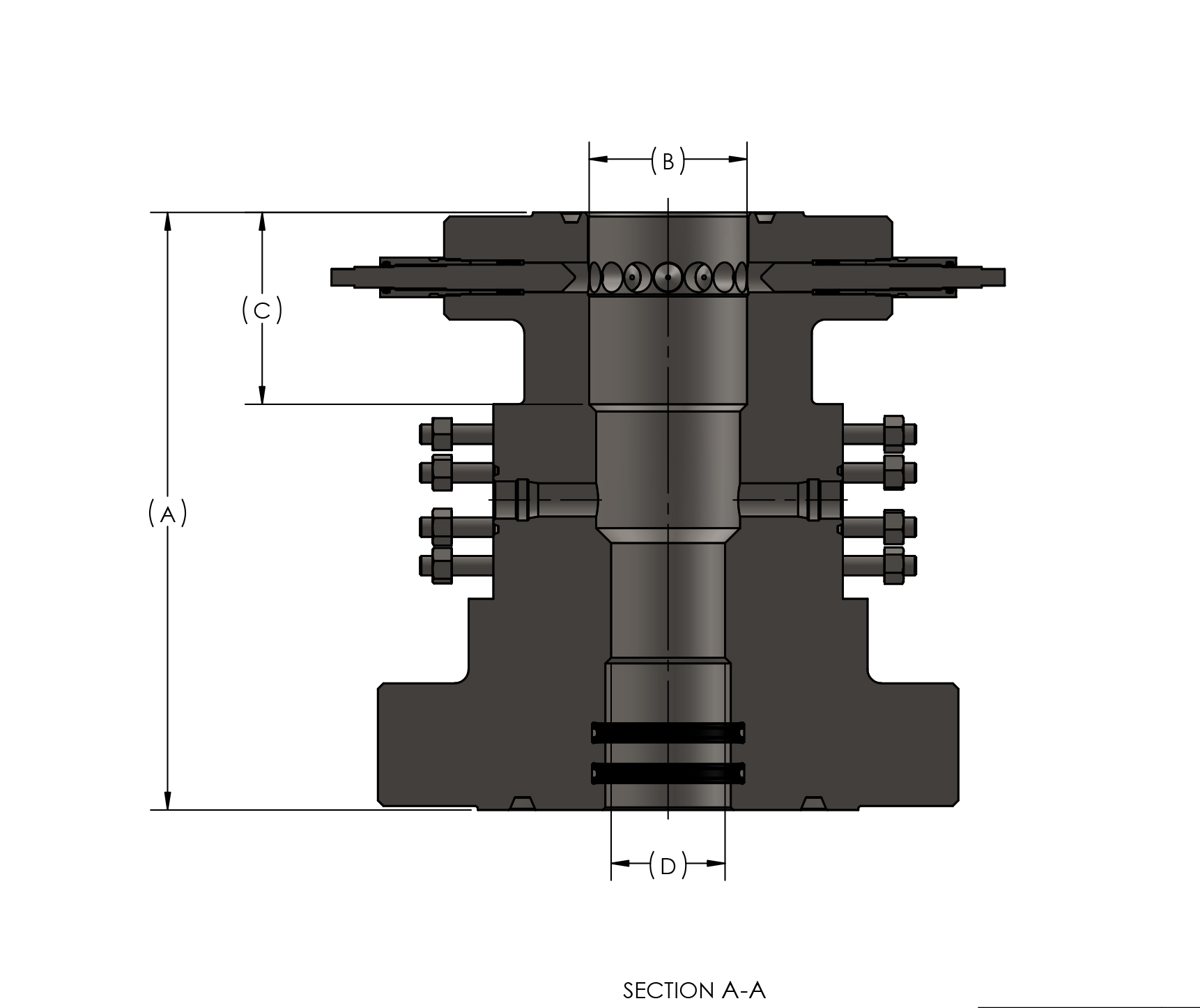 Top Flange (nom size) | Top Flange Pressure PSI | Lower Flange (nom size) | Lower Flange Pressure | Bottom Prep | OAL(A) | Seal Bowl(B) | Bowl Depth(C) | Min. Bore(D) |