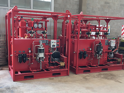 Cabezal de seguridad con tanque de combustible de 30 galones, impulsor con correa en V para generar 8,6 GPM a 15.000 psi. Montado en camión para pruebas de campo, torque y engrase.